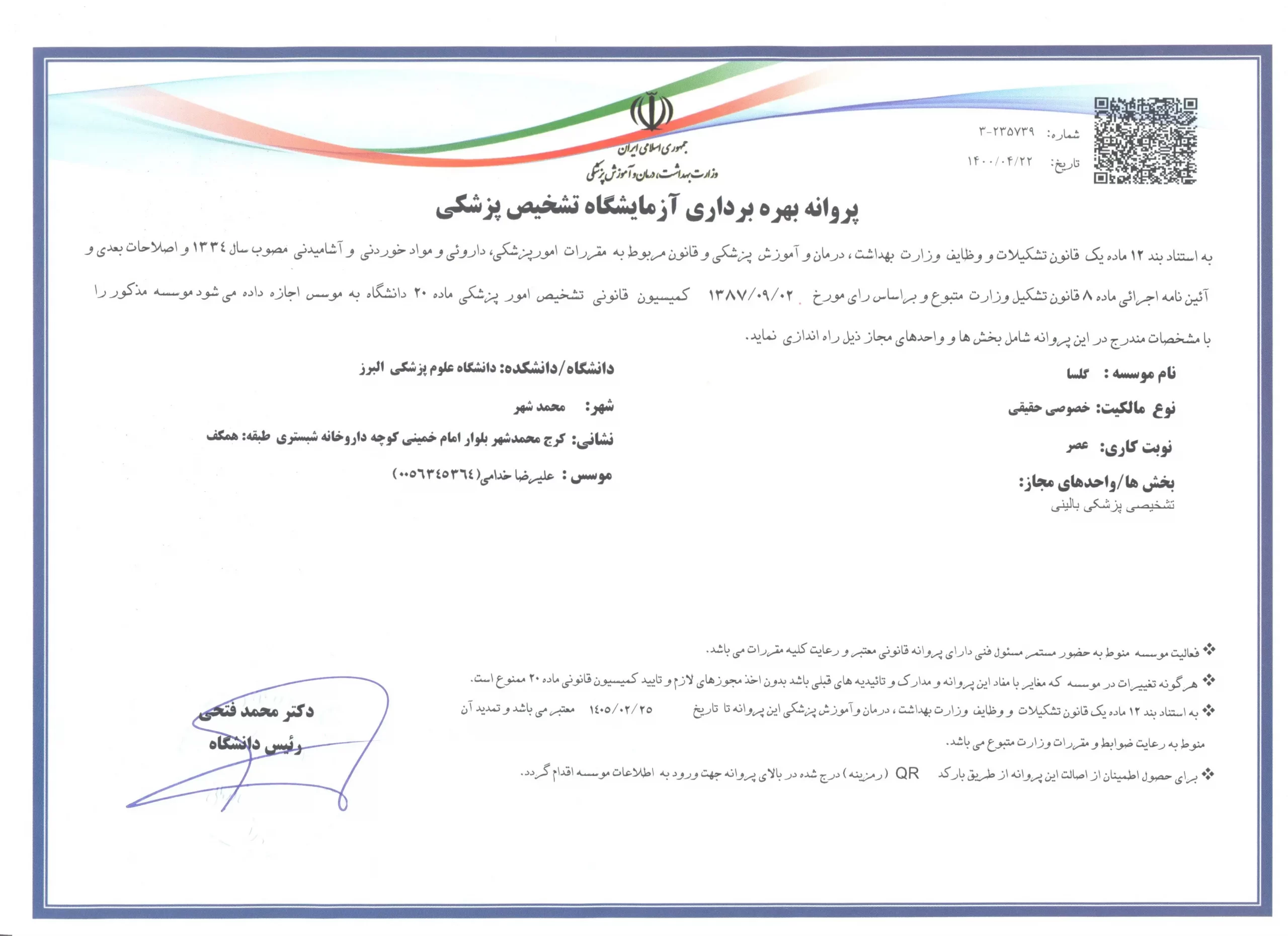 تلفن: ۰۲۶۳۶۲۰۷۶۳۴ – ۰۲۶۳۶۲۱۷۵۳۷ | نمونه گیری در منزل: ۰۹۱۲۵۰۲۹۷۸۶ | ۲۴ ساعته در خدمت سلامتی شما