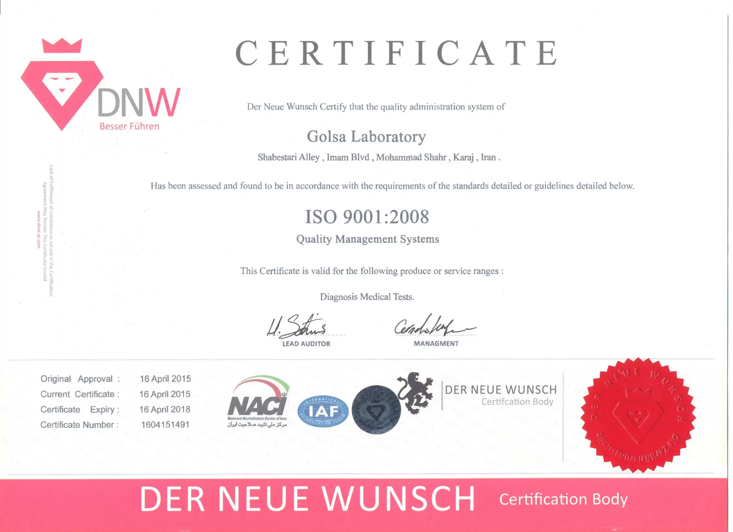 یکی از مهمترین الزامات خدمات آزمایشگاهی ، وجود سیستم مدیریت کیفیت در آزمایشگاه است. آزمایشگاه گلسا در جهت ارتقاء کیفیت خدمات آزمایشگاهی و افزایش سطح رضایتمندی مراجعین و پزشکان محترم، اقدام به استقرار سیستم مدیریت کیفیت بر اساس الگوی استاندارد بین المللی ایزو 15189 نموده است.در این راستا ، کلیه امور جاری آزمایشگاه مستند سازی شده و کلیه فعالیت ها بر اساس دستورالعمل های (sop) مصوب انجام می شود.